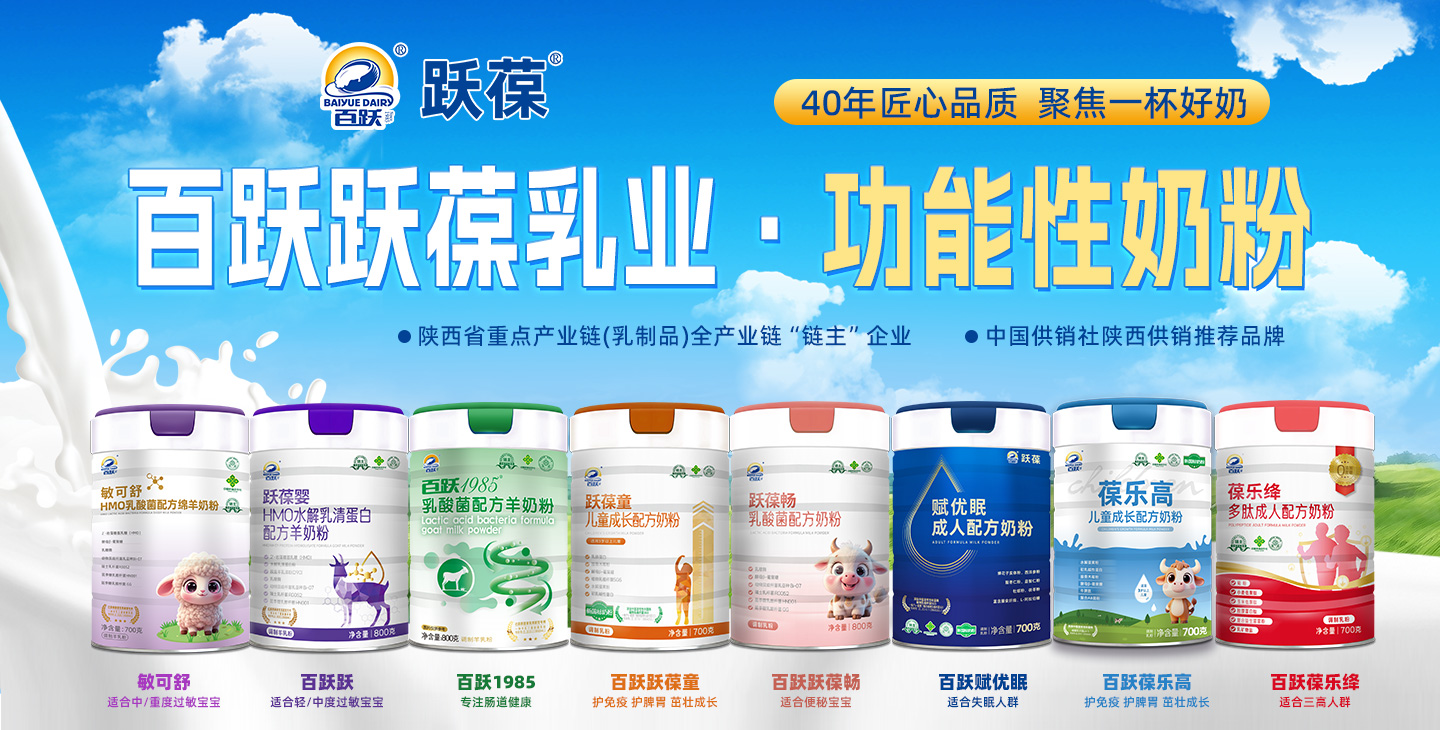西安百躍躍葆乳業(yè)有限公司,是西安百躍羊乳集團(tuán)有限公司旗下控股子公司,專注于功能性特種乳粉的研發(fā)、生產(chǎn)、銷售及服務(wù)。作為乳制品行業(yè)資深企業(yè)百躍集團(tuán)的新銳力量,躍葆乳業(yè)依托母公司40余年羊乳制品生產(chǎn)經(jīng)驗(yàn)及全產(chǎn)業(yè)鏈優(yōu)勢,采用國際先進(jìn)生產(chǎn)工藝和檢測技術(shù),致力于為消費(fèi)者提供鮮醇、營養(yǎng)、健康、好喝的乳粉產(chǎn)品。