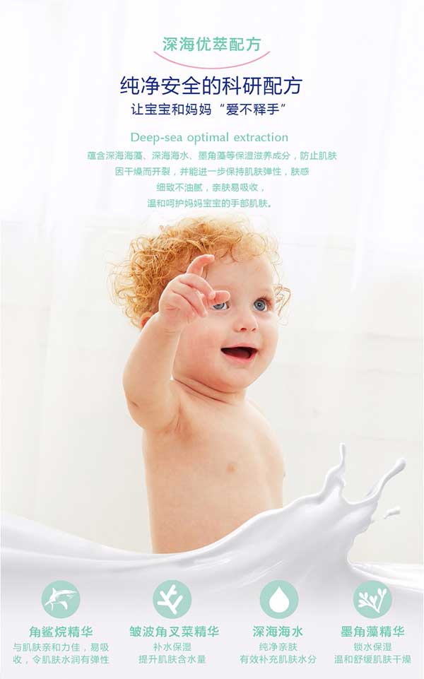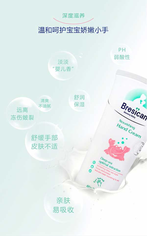 Bresican貝施康滋養(yǎng)護手霜是 “深海優(yōu)萃”系列的護手產(chǎn)品,根據(jù)嬰兒特殊肌膚PH特點研制,從深海中萃取自然純凈成分,配方做到純正安全,讓媽媽心安!