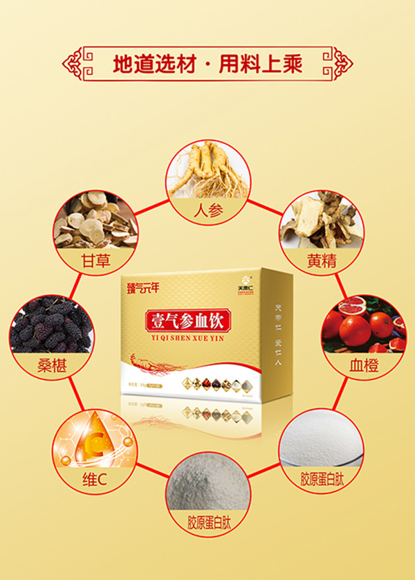 生命益元素臻氣元年,地道選材,用料上乘,以人參、黃精、血橙、甘草、桑椹等為主要原料,藥食同源配方,添加膠原蛋白肽、維生素C,科學(xué)配比,營養(yǎng)均衡。
